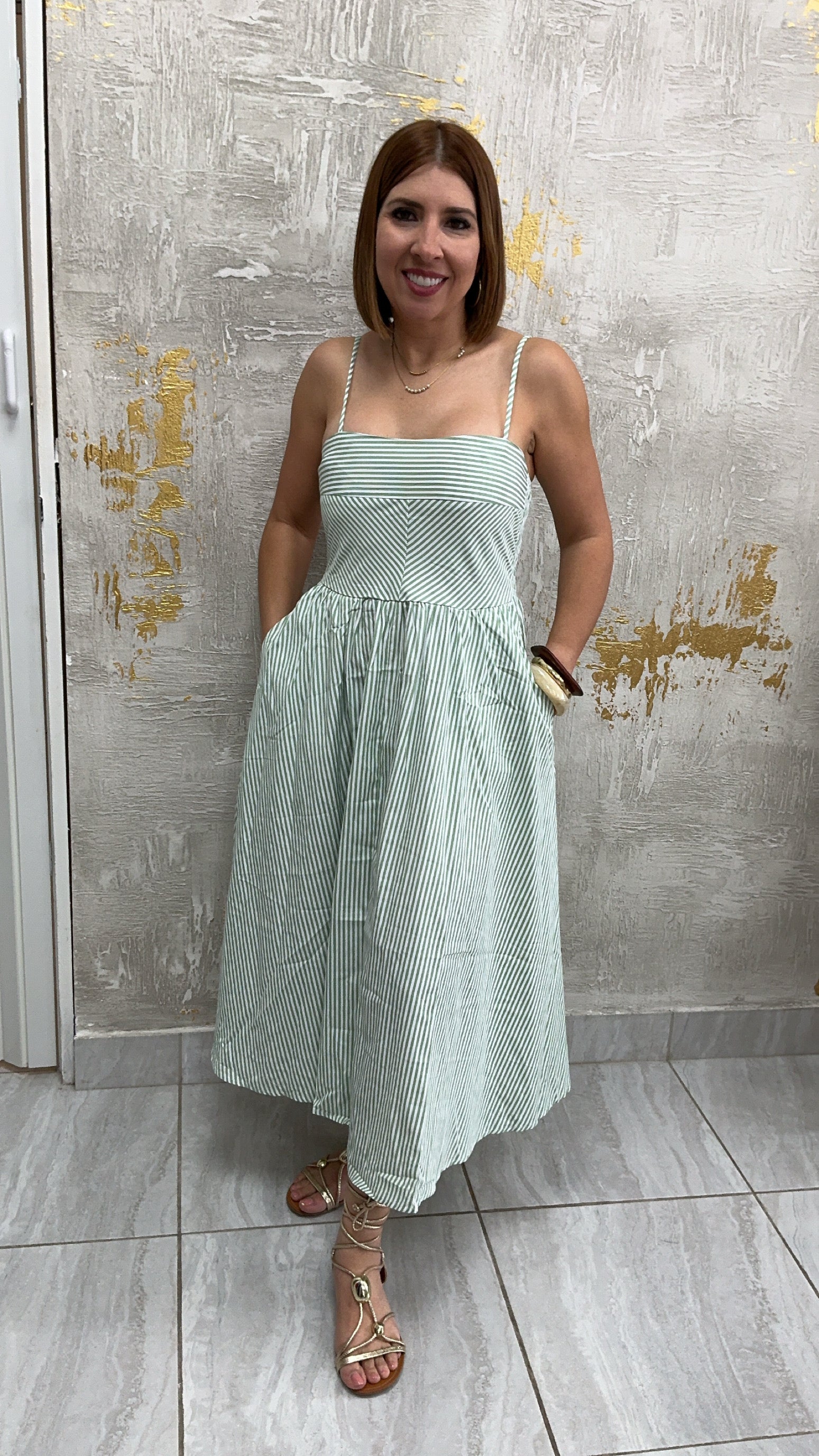Vestido semi Corto con elastico en la espalda,straps ajustables,bolsillos funcionales.